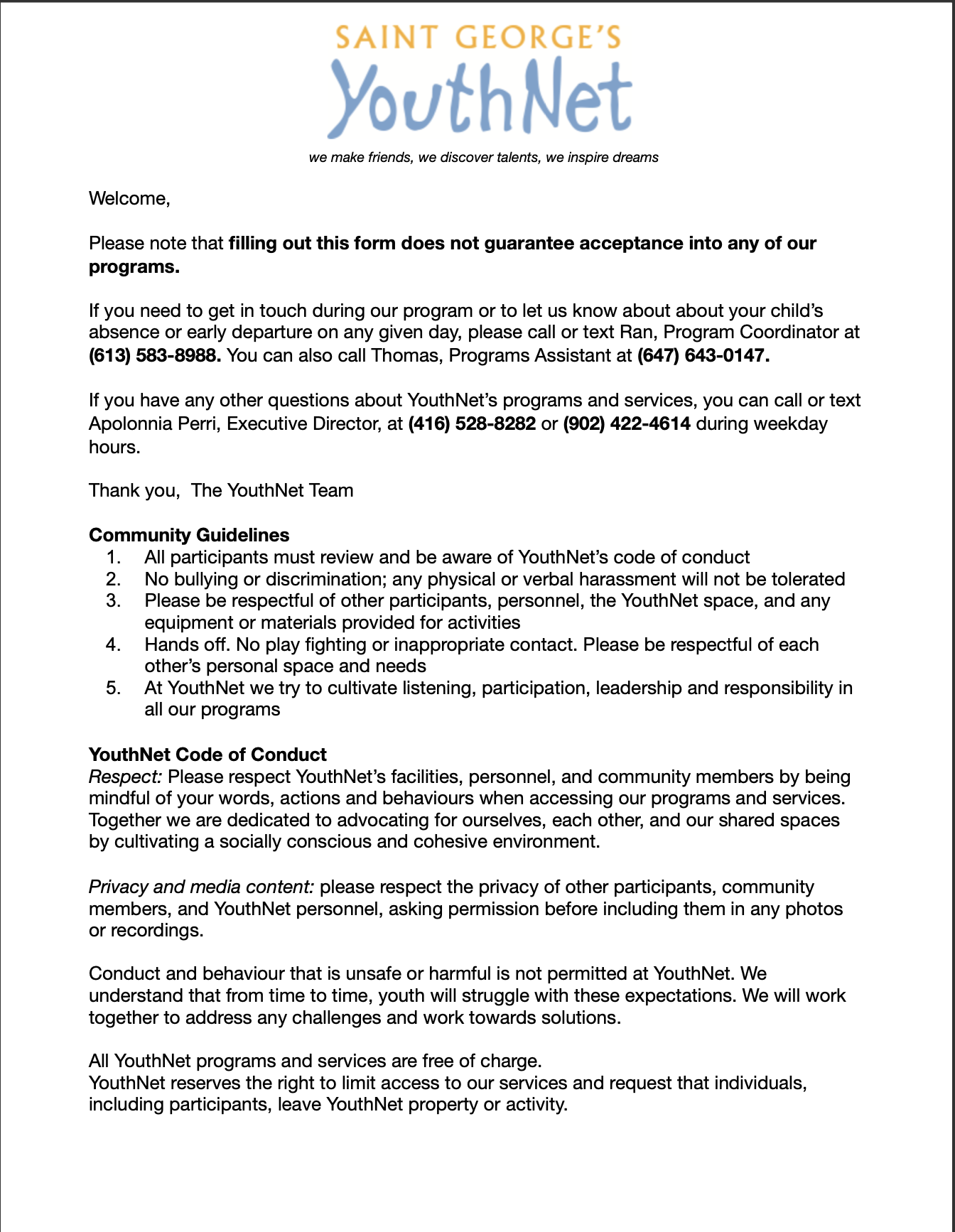 After-school Program is for any child in the neighbourhood, between grades 2 -6. We pick kids up at Joseph Howe School after the dismissal bell, or you can arrange for your child to meet us at YouthNet around 3pm. Starts Wednesday Sept 25 2024